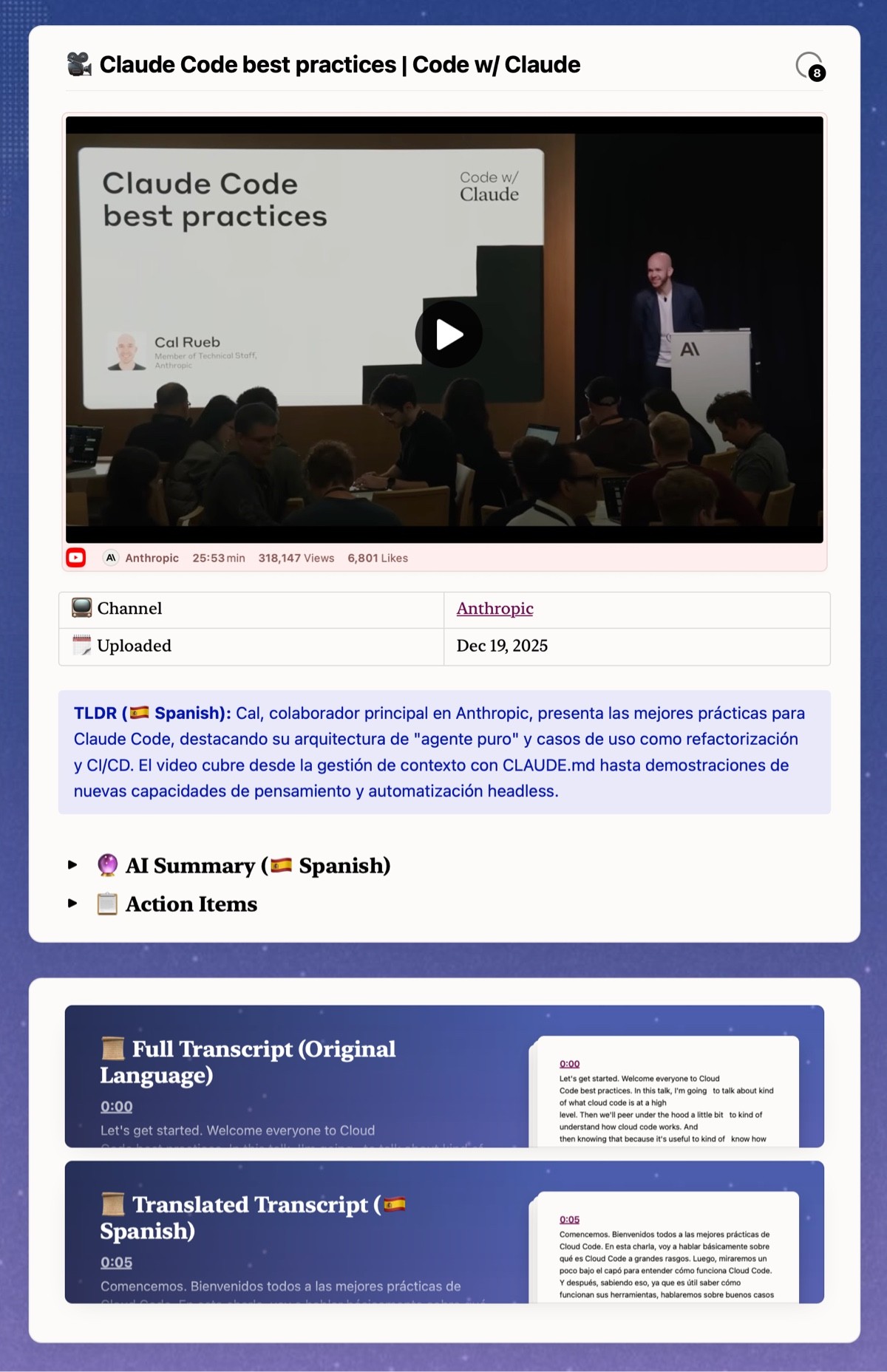 A YouTube transcription and translation app that generates action lists, main points, and AI summaries. Works with or without bringing your own AI key (BYOK).