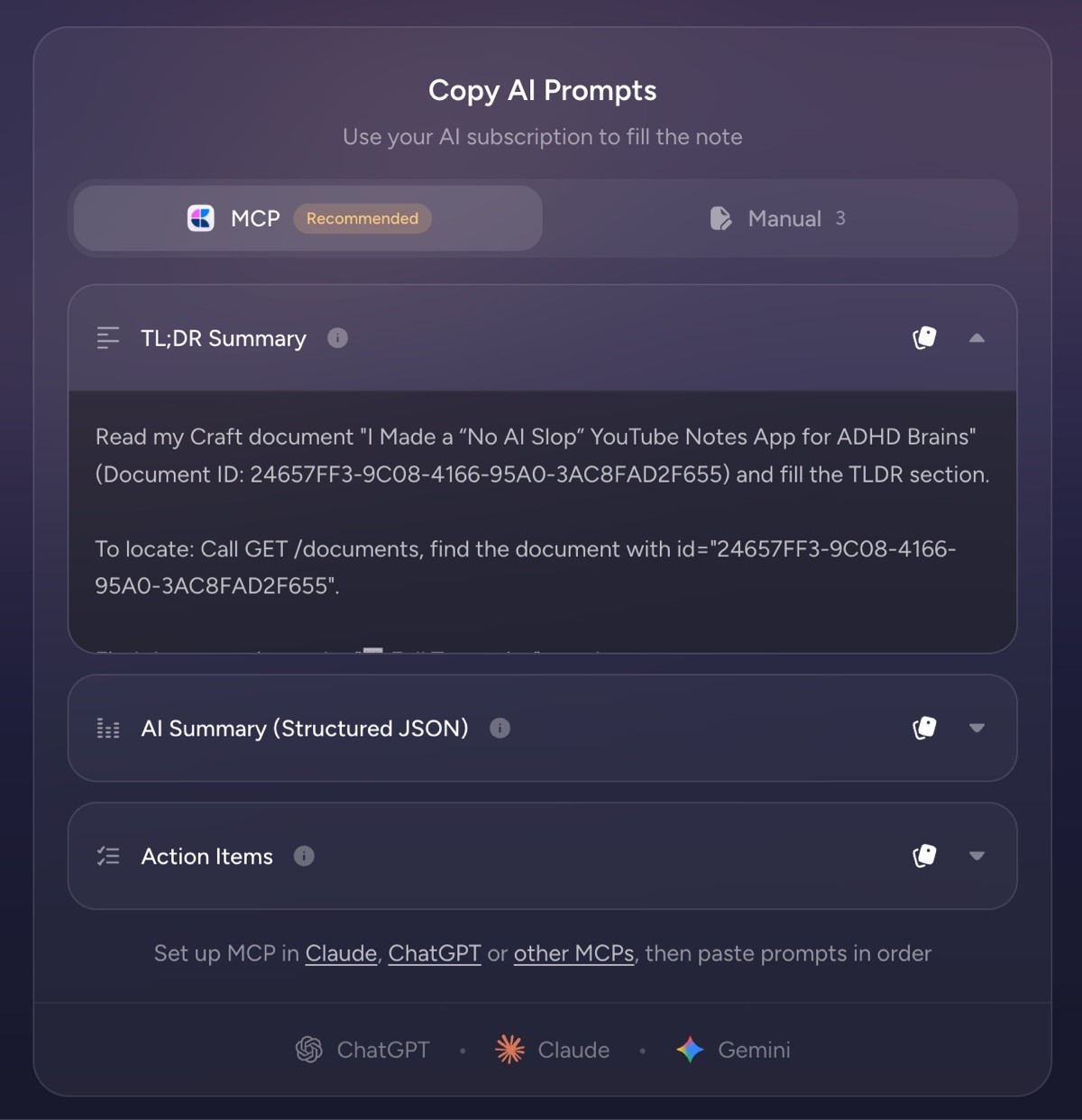 MCP Prompt | App generates prompt → paste in Claude with Craft MCP → AI creates tasks directly | Free |