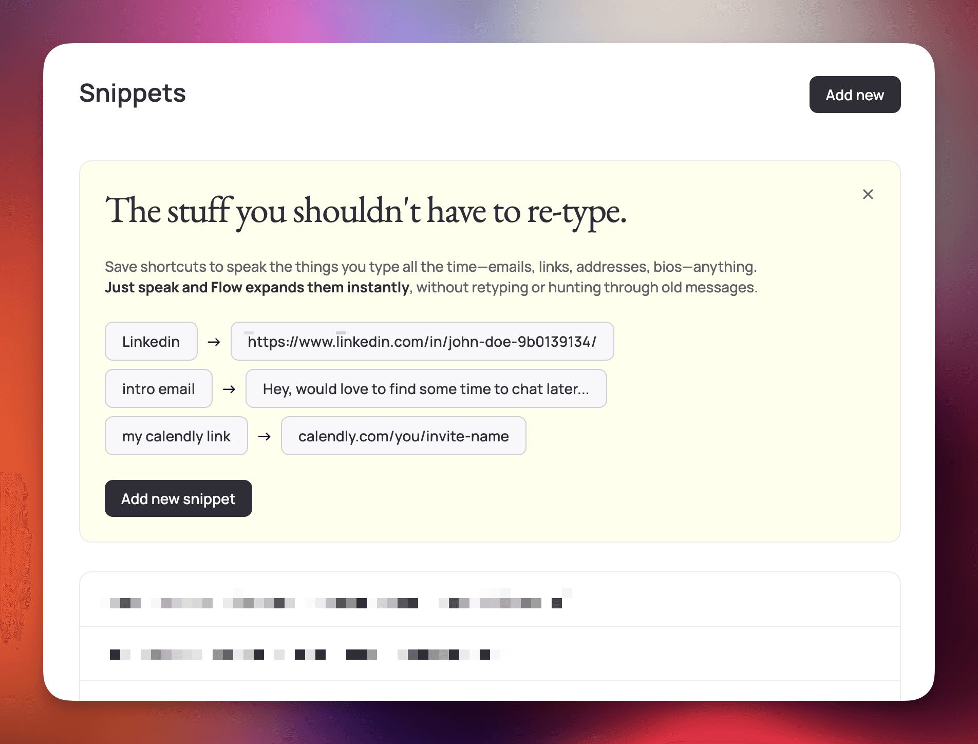 snippets: shortcuts for stuff we say all the time (wispr flow has this)